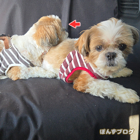 帰りは、かぼすがぽんず母さんの背中にあご乗せ。